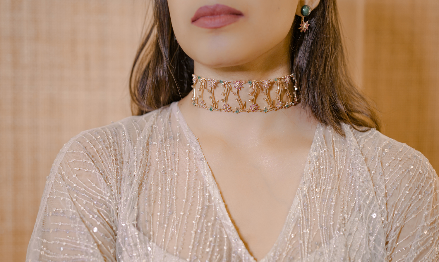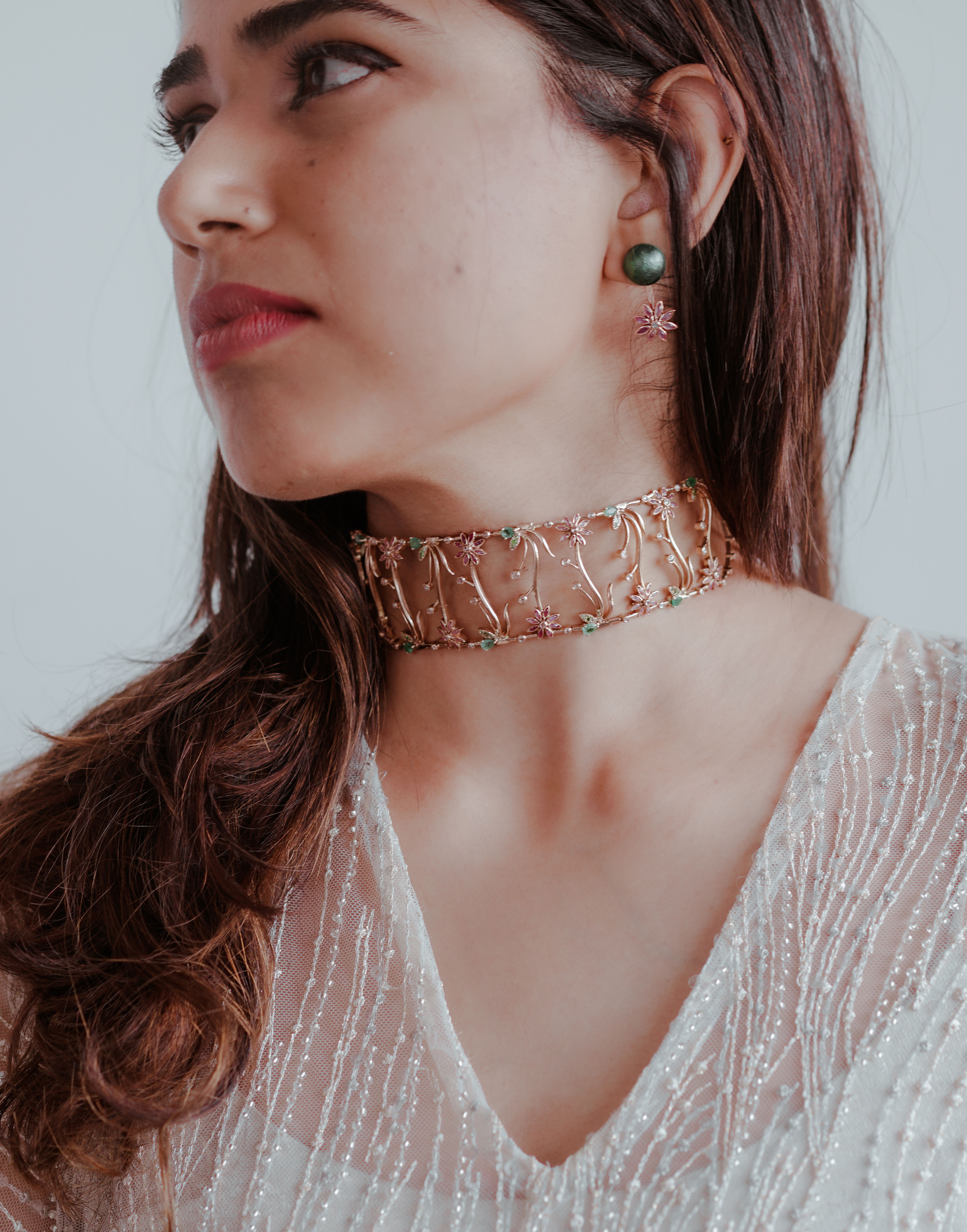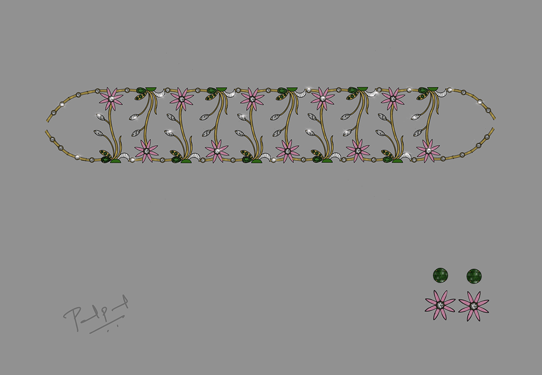 Zambian Emeralds portray the leaves canoodling the flowers. The rose cut Diamonds depict the water droplets finding a haven within. Finally Minakari craftmanship on rose gold to bring the story to life.